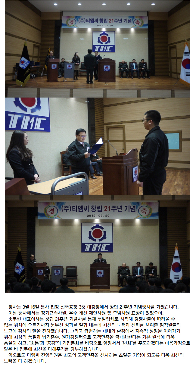 창립 21주년 기념행사(3.16) 페이지 정보 작성일 : 12-03-21 조회수 : 28,176회 본문 . 목록 이전글지식경제부 주관 "2012 우리지역 일하기 좋은 기업" 선정(4.30) 12.04.30 다음글2012년 시무식 개최(1.3) 12.01.03