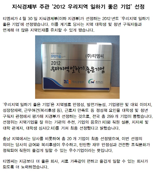 지식경제부 주관 "2012 우리지역 일하기 좋은 기업" 선정(4.30) 페이지 정보 작성일 : 12-04-30 조회수 : 27,089회 본문 목록 이전글(중앙일보,7/10)천안아산지역 우량기업을 가다 12.08.07 다음글창립 21주년 기념행사(3.16) 12.03.21