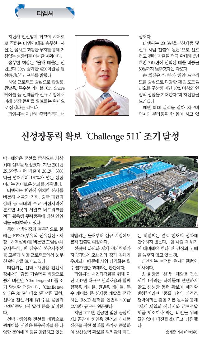 (터닝포인트) 티엠씨 신성장동력 확보 (전기신문, 1/3) 페이지 정보 작성일 : 13-01-07 조회수 : 26,410회 본문 목록 이전글조선업 불황에도 설비 증설… 2억달러 수출(중앙일보, 2/25) 13.02.25 다음글2013년 시무식 개최 13.01.02