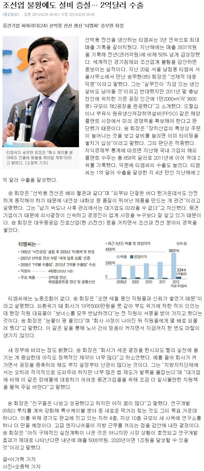 조선업 불황에도 설비 증설… 2억달러 수출(중앙일보, 2/25) 페이지 정보 작성일 : 13-02-25 조회수 : 25,673회 본문 목록 이전글창립 22주년 기념식(3. 18) 13.03.20 다음글(터닝포인트) 티엠씨 신성장동력 확보 (전기신문, 1/3) 13.01.07