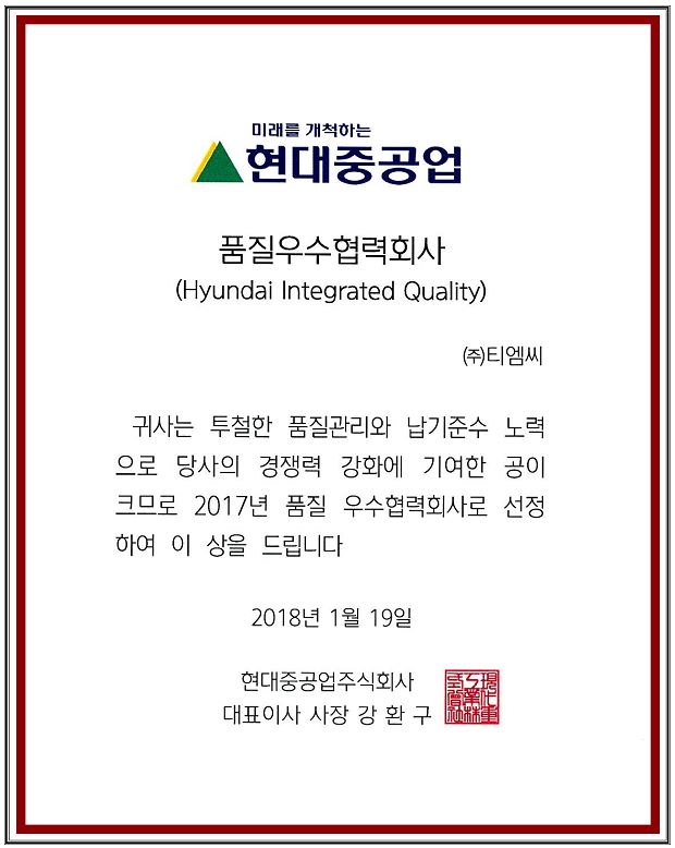 티엠씨, 2017년 현대중공업 품질우수협력회사 선정 페이지 정보 작성일 : 18-01-29 조회수 : 19,825회 본문 티엠씨는 2018년 1월 19일(금) 경주 현대호텔에서 열린 '현대중공업그룹 통합협의회' 행사에서 그동안 어려운 조선 환경에도 불구하고, 우수한 제품 품질과 철저한 납기로 현대중공업의 대외경쟁력 향상에 크게 기여한 바를 인정받아 품질우수협력회사로 선정되었습니다. 티엠씨와 현대중공업은 이번 행사를 통해 더욱 확고한 신뢰와 협력 관계를 구축하게 되었습니다. 목록 이전글티엠씨, 창립 27주년 기념식 개최 18.03.21 다음글2017 티엠씨 노사화합 한마당 체육대회 개최 17.10.17