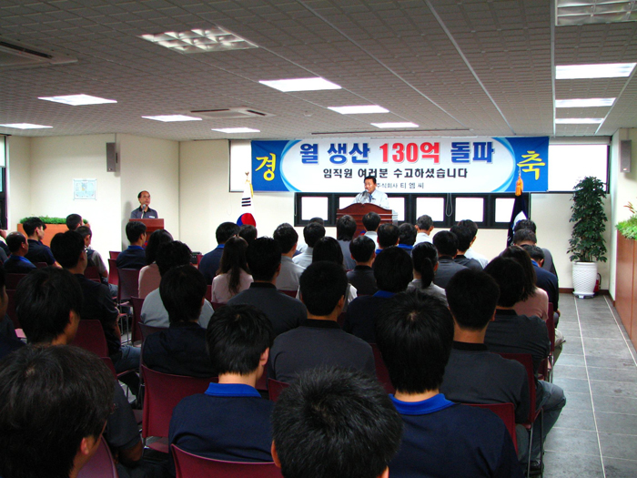 7월 월례조회 실시(7.4.) 페이지 정보 작성일 : 07-07-04 조회수 : 27,851회 본문 7월 4일(수) 오전 8시 30분 입장/북면 공장에서 7월 월례조회를 실시하였습니다. 선박선 생산 130억 달성을 기념하는 자리이기도 한 이번 조회에서는 6월 개선 제안 활동과 공동과제개선에 대한 시상과 송무현 대표이사의 조회사가 있었습니다. 송무현 대표이사께서는 “이른 더위와 장마에도 목표달성을 위하여 열심히 일해 준 직원들의 노고에 감사”하고 "우리가 가진 가장 큰 경쟁력은 해낼수 있다는 자신감과 적극적인 실천" 이라고 강조하셨 습니다. 이번 목표 달성을 계기로 당사는 최고의 납기경쟁력을 가지고 있다는 것을 입증하였으며 앞으로도 품질안정과 납기준수로 고객 감동을 위해 최선을 다하도록 하겠습니다. 목록 이전글2007년 세계일류상품 인증서 수상 07.08.27 다음글선박용전선 세계 일류 상품 생산기업 선정 07.07.02