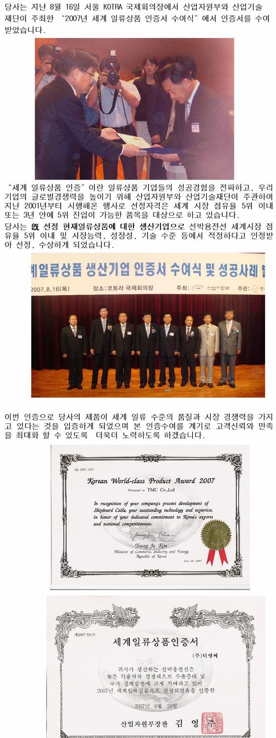 2007년 세계일류상품 인증서 수상 페이지 정보 작성일 : 07-08-27 조회수 : 27,044회 본문 목록 이전글당사 참여 "AGBAMI FPSO" 출항 07.10.08 다음글7월 월례조회 실시(7.4.) 07.07.04