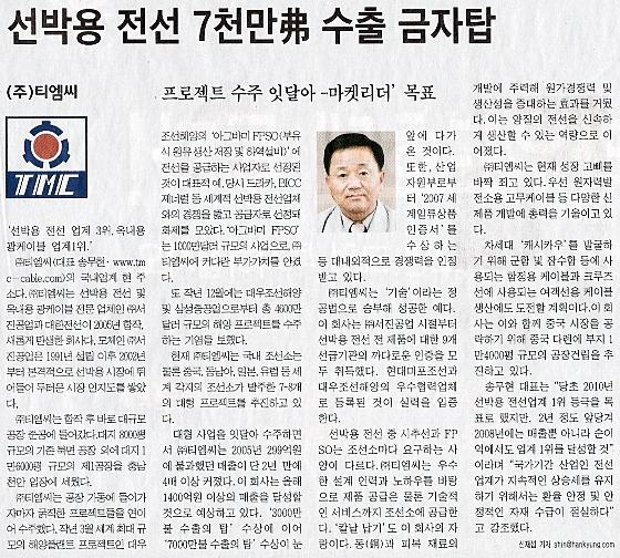 (주) 티엠씨‥선박용 전선 7천만弗 수출 금자탑(한국경제,11/27) 페이지 정보 작성일 : 07-11-27 조회수 : 28,096회 본문 목록 이전글대한전선, PRYSMIAN 임원 방문(11/27) 07.11.28 다음글당사가 케이블 납품한 삼성중공업 드릴쉽(STENA Drillship) 사진 및 관련기사 07.11.13