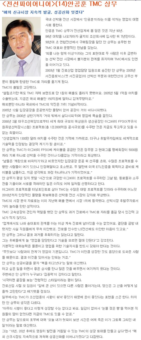 전선파이어니어-안공훈 TMC 상무(전기신문, 9/22) 페이지 정보 작성일 : 08-09-22 조회수 : 27,976회 본문 목록 이전글전선특집-초경쟁 TMC (전기신문, 9/29) 08.09.30 다음글OHSAS 18001 취득 08.08.11
