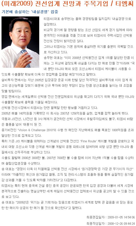전선업계 전망과 주목기업/티엠씨(전기신문, 1/5) 페이지 정보 작성일 : 09-01-06 조회수 : 33,790회 본문 목록 이전글삼성 Q SILVER MARK 인증 획득 09.03.16 다음글1억불 수출의 탑 및 철탑산업훈장 수상 08.12.03